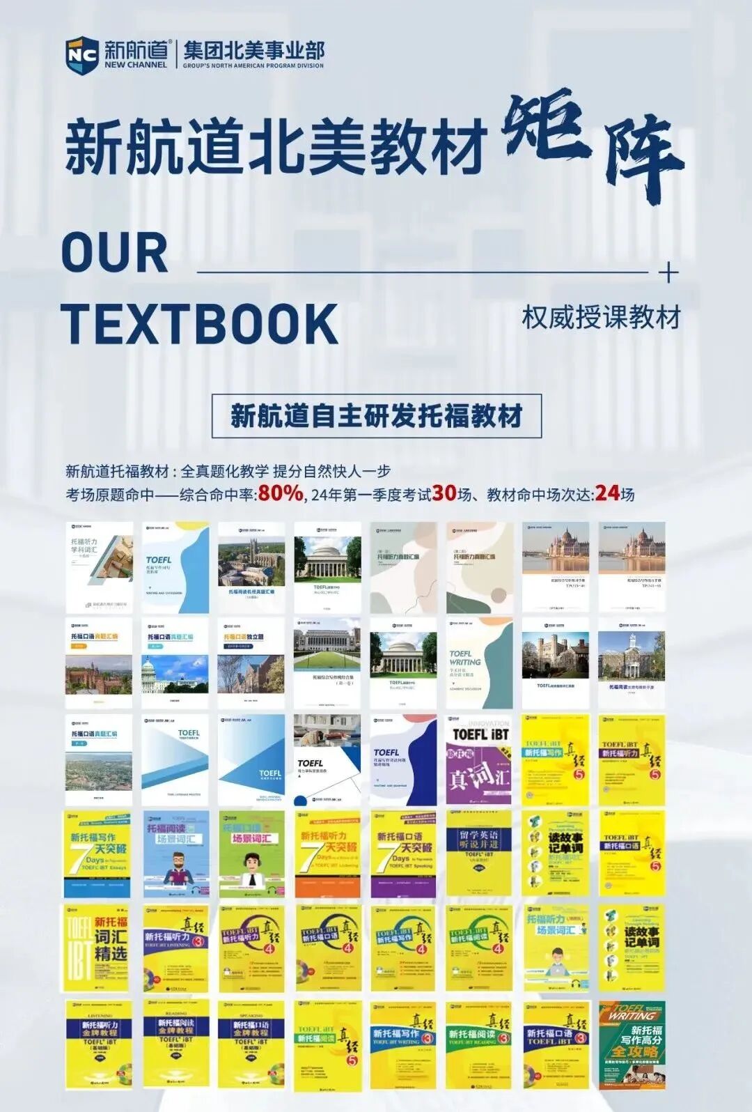 坚持采用自主研发教材,不断迭代,形成统一的大纲有利于更好的教学,有助于各支线协同教学,真正做到知识点不赘余,不遗缺。教材由新航道学校的雅思团队为广大考生倾力推岀,侧重培养考生应试策略和语言技能,帮助学生在备考过程中做到有的放矢,事半功倍。揭示雅思的岀题规律,破解考试所涉及的题型。