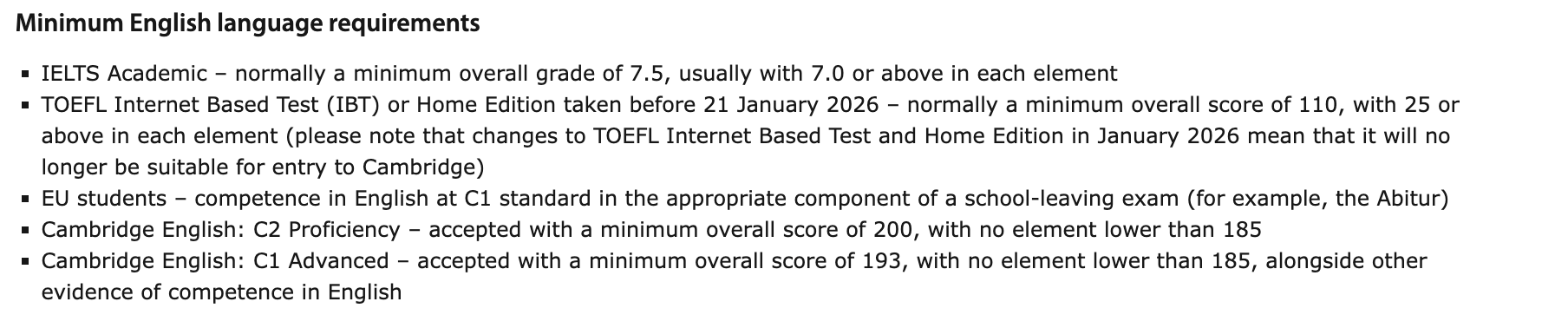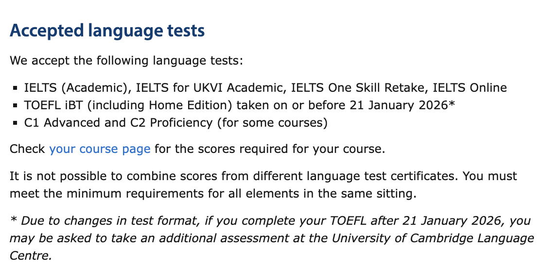 ↑ ↑ 剑桥大学对于申请研究生的国际学生语言要求:如果是 26 年 1 月 21 日托福成绩即新版托福,还需要通过剑桥大学另外的语言评估考试,同样可以解读对新版托福不予完全接受。