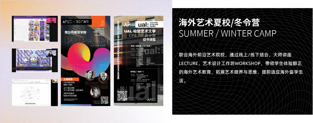 针对群体:这是一项与西方完全同步的通识课程。针对于没有艺术通识理论,思维逻辑训练,初级涉列艺术领域申请本科学位的学生群体去搭建以实践为核心的艺术创作课程,提前引导学员进入西式化教学体系。
